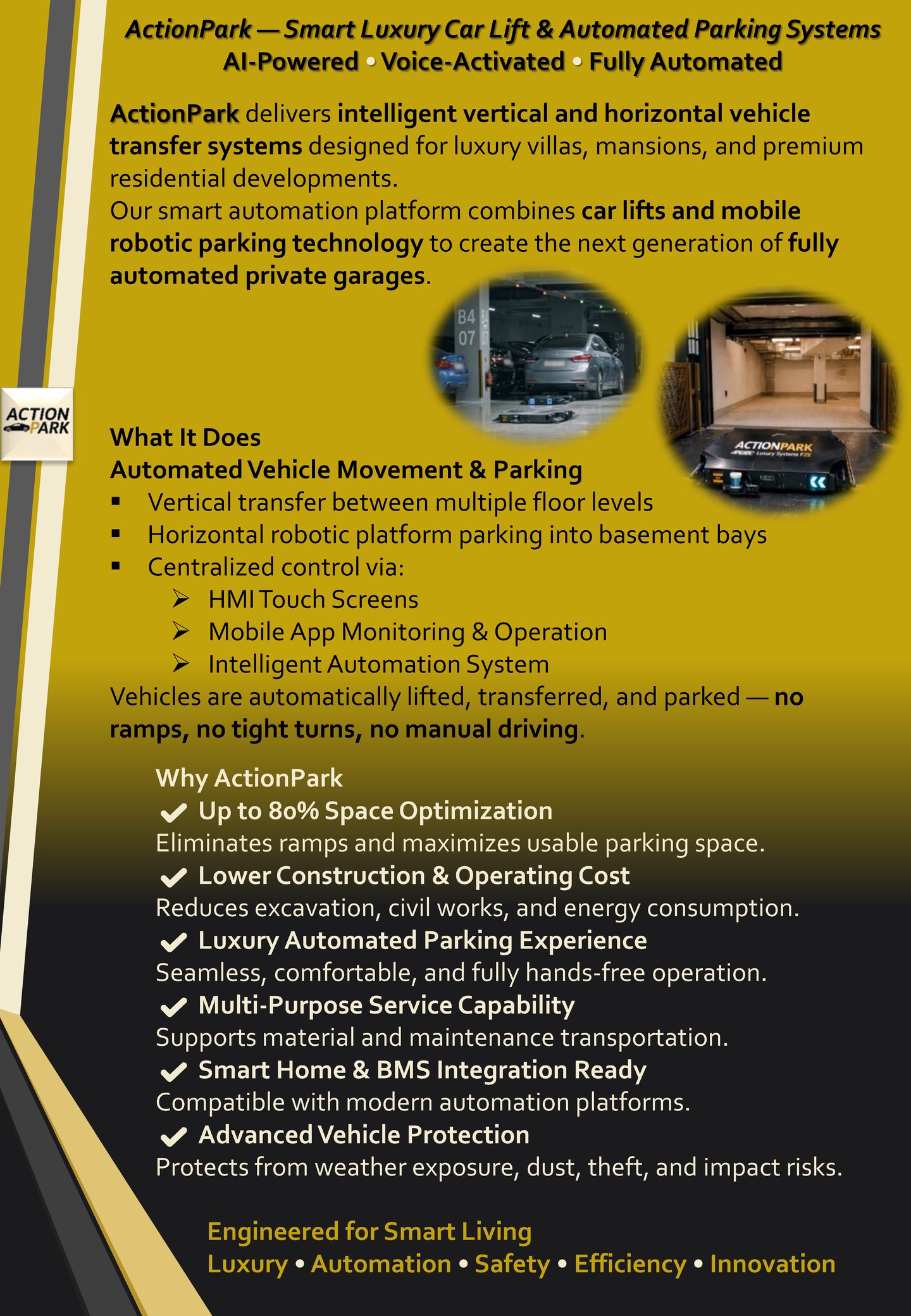 Our state-of-the-art car lifts, powered by AI, allow effortless vehicle management with simple voice commands. Designed for luxury and convenience, they integrate with home automation systems like Amazon Alexa and Google Assistant, offering smooth operation and enhanced safety. Elevate your parking experience with sleek, high-end design and advanced technology, transforming the way you interact with your vehicles.